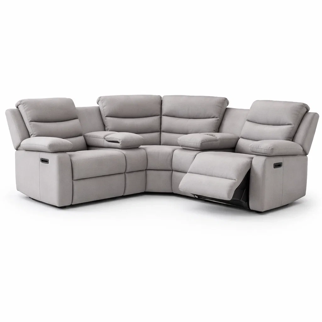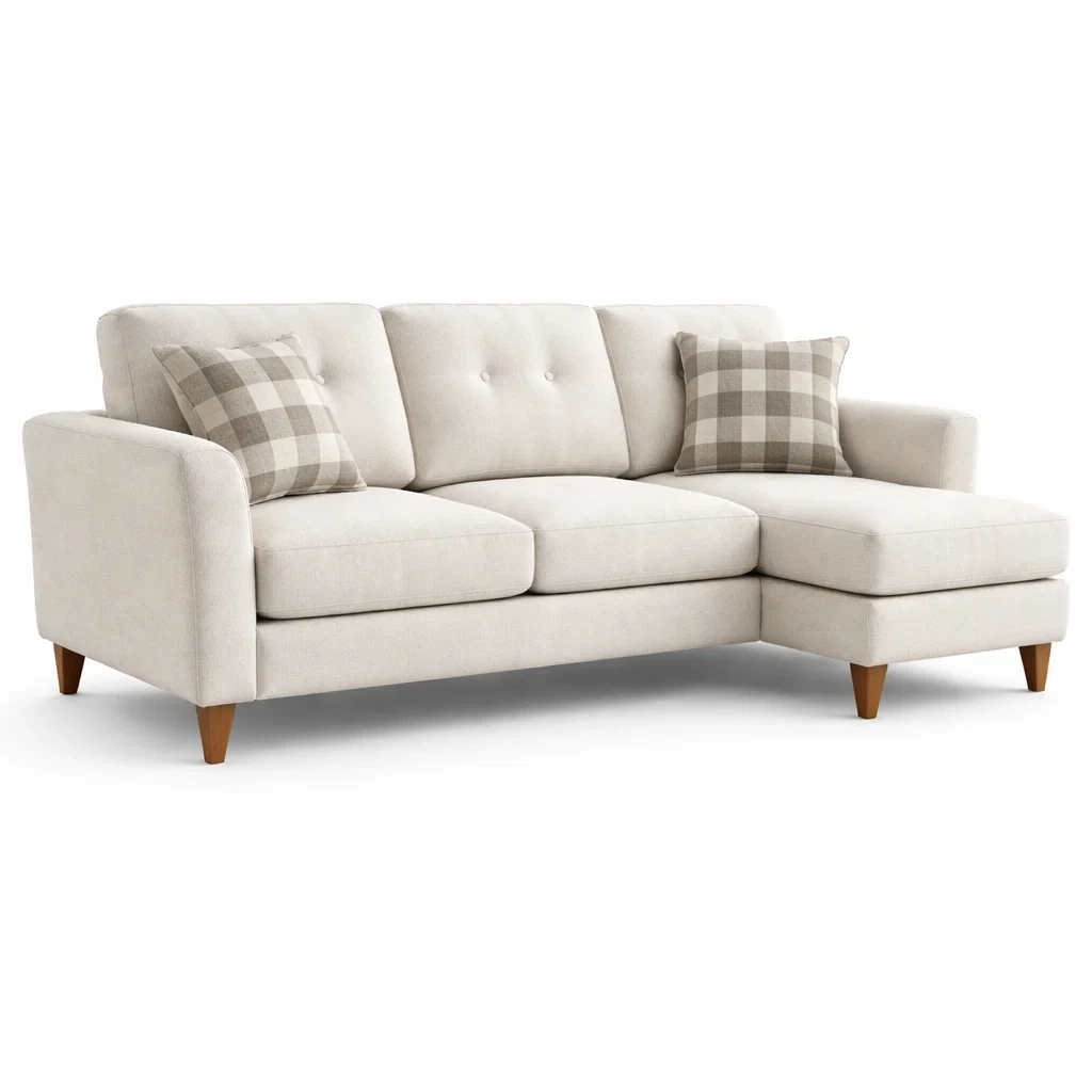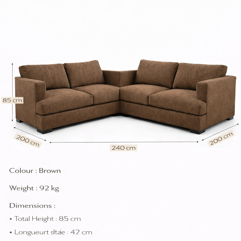 This L-shaped corner sofa features a clean, structured design with a brown fabric finish, suitable for a variety of living room layouts. The symmetrical corner configuration allows flexible placement, making it practical for medium to large spaces.The sofa includes generously sized seat cushions and supportive back cushions, offering a balanced sitting experience. Its solid form and neutral colour make it easy to coordinate with different interior styles.